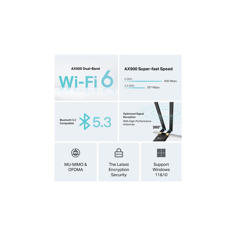 | Gamintojo prekės serija | AX900 Wi-Fi 6 Bluetooth PCIe Adapter |